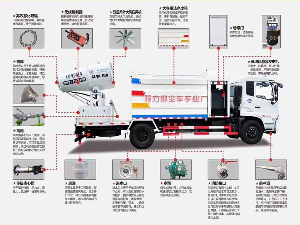 • 噴霧抑塵車:用于鐵路煤炭運輸煤揚塵污染防治,也廣泛用于其它散裝物料運輸過程防揚塵污染以及渣料場、儲煤場、建筑工地、汽車運煤揚塵、固沙、鋼鐵建材、水泥、企業各種露天料場生態護坡等方面。同時具備灑水車功能,在噴灑作業時可實現360度旋轉,后平臺高炮可同時進行旋轉,并可電子遙控操作,射程25-120米均有。