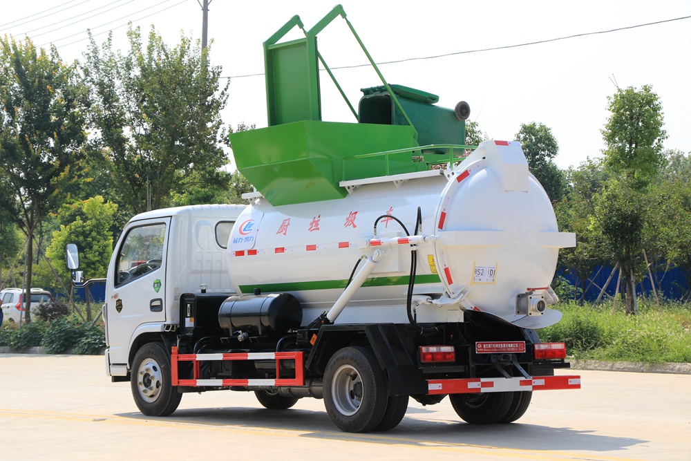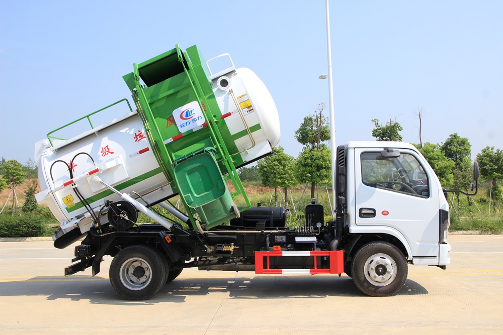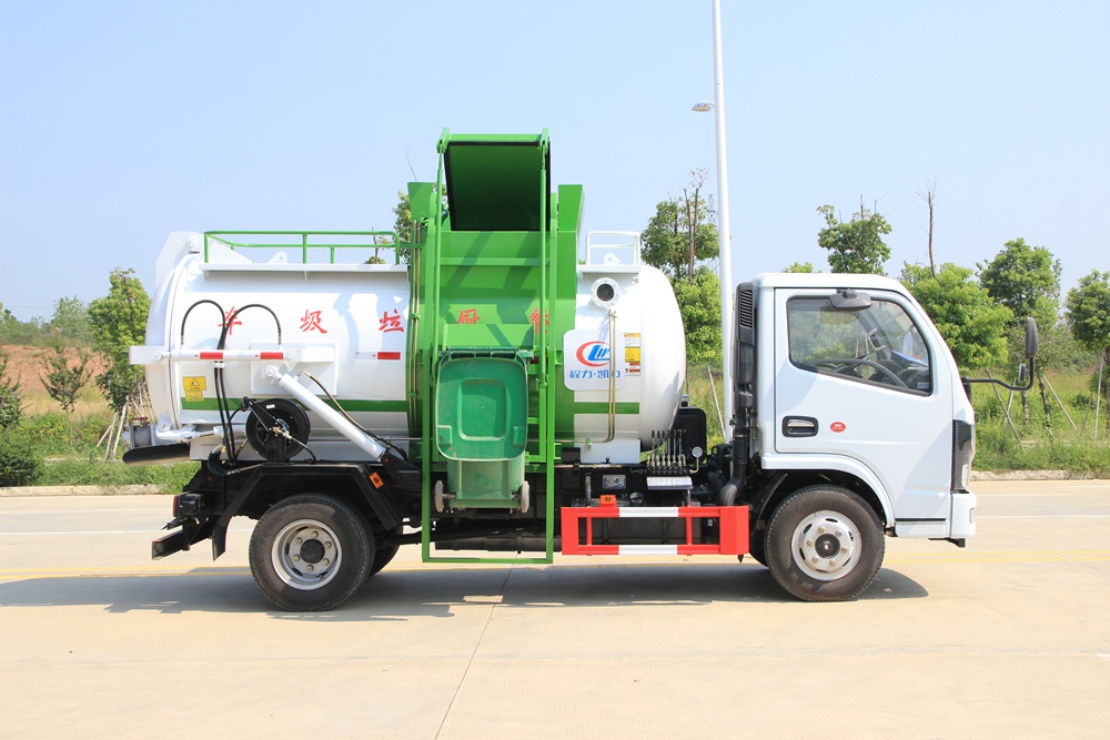 罐體內分上、下兩層,下層為固液分離后污水收集箱,污水箱兩頭高,中間低,最低端設有出水口,以保證污水排放干凈,料口及后門為液壓密封,上料為提升拉桿式,罐體帶舉升自卸功能,讓排泄更徹底干凈。餐廚垃圾車除了單一的運輸、收集外,還可選裝固液分離裝置、吸污功能、罐體清洗功能等。液壓系統由泵、液壓閥和順序閥以及各種功能的液壓油缸、高低壓管路組成。關鍵部件可選用原裝進口,保證產品工作可靠、安全。垃圾投入口與推板之間有足夠距離,推板與罐體內表面設有密封裝置,避免餐廚垃圾投入過程及分離過程中溢到推板后方。