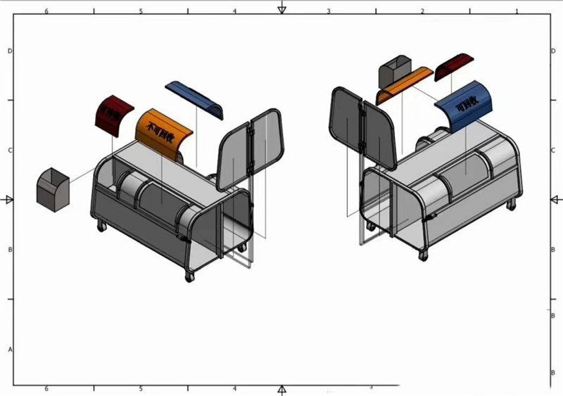 4.箱體Q235碳鋼,側板實際厚度mm:1.8/2.5,垃圾箱前后門主骨架采用50*30*1.5mm厚Q235方管,底部槽鋼100*50*2mm矩形方筒,底板采用兩根50*30*1.5mm方管及一根鎖緊方管(40*40*1.5mm),箱體前掛鉤采用3cm直徑鋼筋