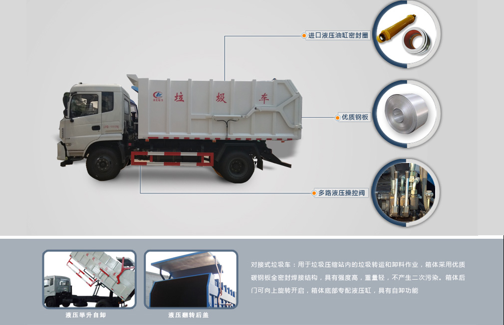 對接式垃圾車又稱壓縮式對接垃圾車:是用于城鎮垃圾壓縮站內的垃圾轉運、卸料作業的專用車,該垃圾車的收運方式是目前國內廣泛采用的垃圾壓縮站垃圾轉運方式,可以實現一車多站,大大降低了配備成本和空間等等。其專用裝置的功能均以汽車發動機為動力,通過液壓機構手動或電控,氣控來實現。車輛的箱體采用優質碳鋼板全密封