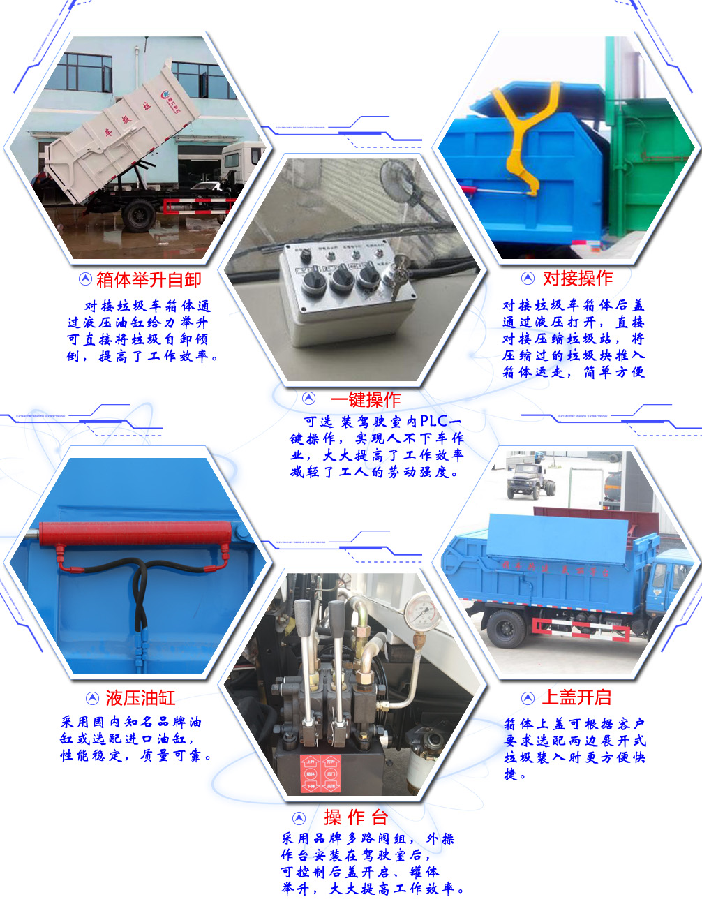 • 對接式垃圾車又稱壓縮式對接垃圾車:是用于城鎮垃圾壓縮站內的垃圾轉運、卸料作業的專用車,該垃圾車的收運方式是目前國內廣泛采用的垃圾壓縮站垃圾轉運方式,可以實現一車多站,大大降低了配備成本和空間等等。其專用裝置的功能均以汽車發動機為動力,通過液壓機構手動或電控,氣控來實現。車輛的箱體采用優質碳鋼板全密封